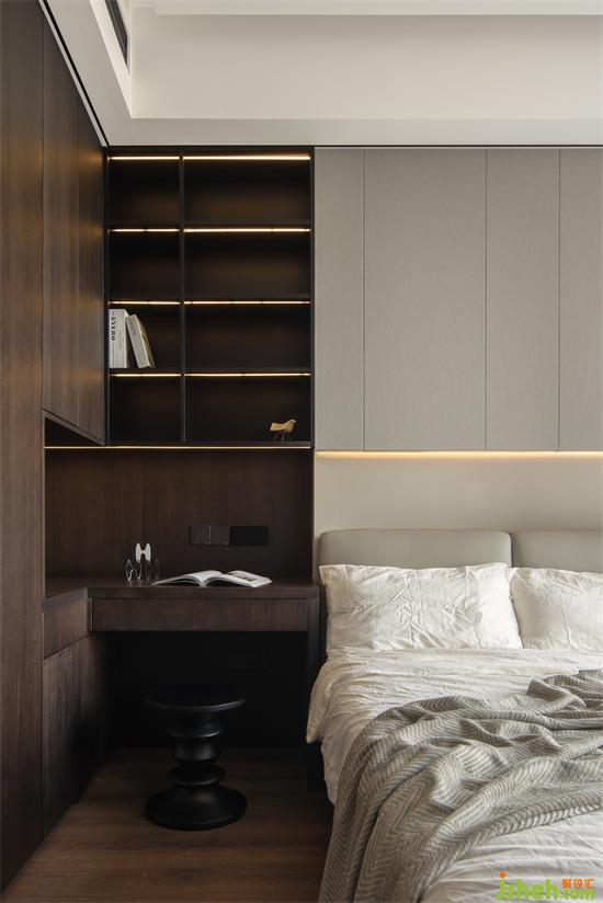 從衣柜中延伸出床頭柜區(qū)域,家裝設(shè)計還能充當(dāng)小書桌與梳妝臺使用,小空間實(shí)現(xiàn)大功能,層層開放格搭配燈帶,書柜功能區(qū)也是臥室氛圍感來源。