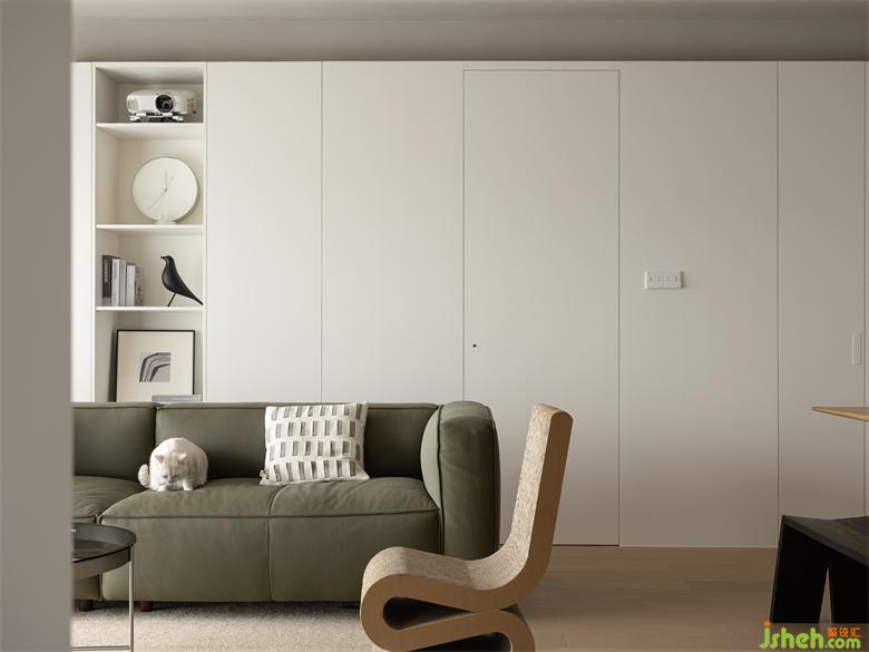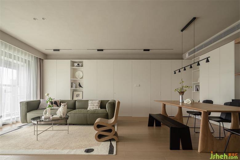 沙發(fā)不靠墻,背景墻打造整面儲物柜,臥室入口隱藏其中,奶油白一直延伸至餐廳區(qū)域,家裝設(shè)計空間整潔統(tǒng)一,視覺效果更加開闊清爽。