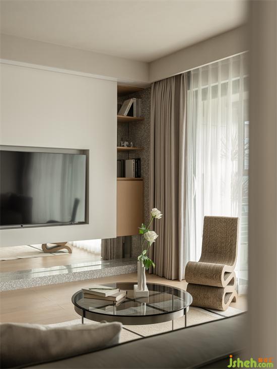 儲物柜中穿插開放格,收納書籍或是作為展示柜,是沙發(fā)背景的點綴,亦能提供豐富多變的儲物方式。