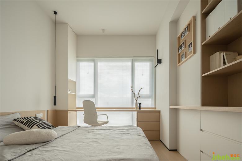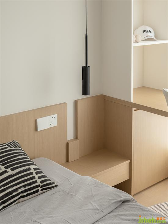 床頭另一側(cè)打造一體式床頭柜,留白處理呼應(yīng)全屋細(xì)節(jié),呈現(xiàn)隨性不刻板的空間氛圍,黑色吊燈亦是做到了整屋統(tǒng)一,小心機(jī)彰顯設(shè)計的溫度。