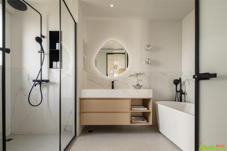 衛(wèi)生間用了三種磚,地面是水磨石瓷磚,墻面下部分采用仿大理石磚,上半部分則是奶白色柔光磚,整體色調(diào)統(tǒng)一,空間清新淡雅、層次豐富。家裝設(shè)計原木浴室柜點(diǎn)綴其中,搭配巖板一體式臺盆,呼應(yīng)全屋調(diào)性。