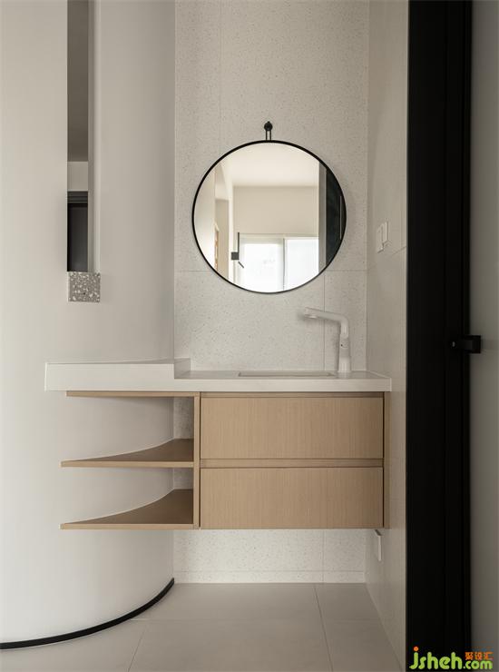 弧形凹面背后隱藏干區(qū)洗漱臺,無論是飯前洗手,還是日常洗水果等等事宜,都無比方便。家裝設(shè)計不浪費(fèi)一絲一毫的空間,弧面處由木工現(xiàn)場制作的浴室柜過渡,視覺上延伸洗漱臺面積,且豐富了儲物功能。