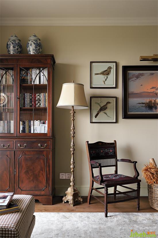 客廳另一邊擺放中古書柜,與餐邊柜質(zhì)感一致,落地?zé)?、臺燈以及壁燈不僅是夜間氛圍燈光,更是重要的軟裝物件,功能與顏值實現(xiàn)統(tǒng)一,對于眾多的燈具,也要提前預(yù)留好插座,做好充分的應(yīng)援。