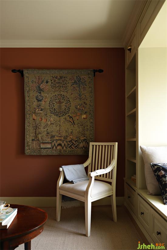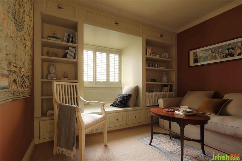 飄窗的設計是整個書房的亮點,原本突兀的飄窗在英式風里稍顯違和,我們設計成書柜+卡座的形式,深圳金地翠堤灣家裝設計打造成一個閱讀角,氛圍瞬間輕松愜意,窗戶也特意改成百葉窗,彰顯英倫風格的獨特復古感。