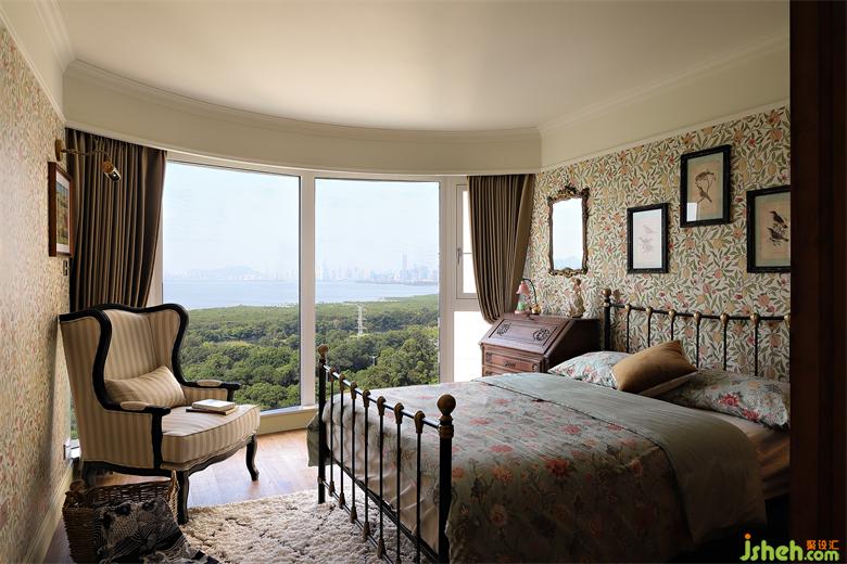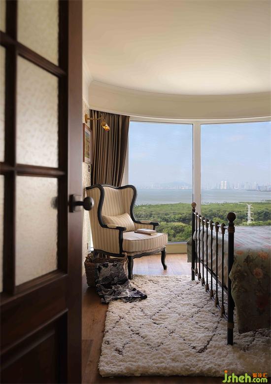 臥室門定制木材搭配壓花玻璃,細節(jié)到門把手,深圳金地翠堤灣家裝設計都是復古精致的款式,圓弧形落地窗盡攬綠樹海洋美景,拉開窗簾的那一刻,瞬間被大自然治愈。