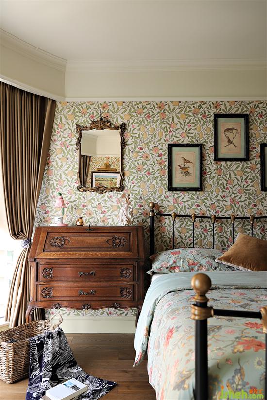 整個臥室以花卉為主題,壁紙以及床品我們選用英國本土品牌William Morris,深圳金地翠堤灣家裝設計讓碎花的復古感縈繞臥室,從陳設到每一件家具,將英倫感武裝到牙齒。