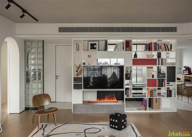 電視墻以一面居中的鏤空書架拉開序幕,作為隔斷靈動有趣,四周的洄游動線讓居家生活自在多變,豐富空間層次感與趣味性。深圳南山東關樂尚林居家裝設計實用性自然也不容小覷,解決屋主的書籍收納問題,大小不一的模塊組合也是空間的精彩展示架。