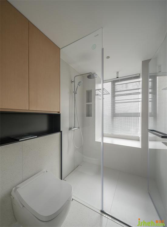 洗漱臺外置走廊,與內部一同形成三分離式布局,深圳南山東關樂尚林居家裝設計同樣的清爽純白色塊,寬敞且光線充足,無論哪個角落均是舒爽之意。馬桶上方搭配原木收納柜,儲存衛(wèi)生間生活用品,便捷實用。