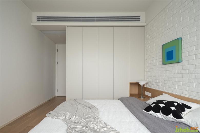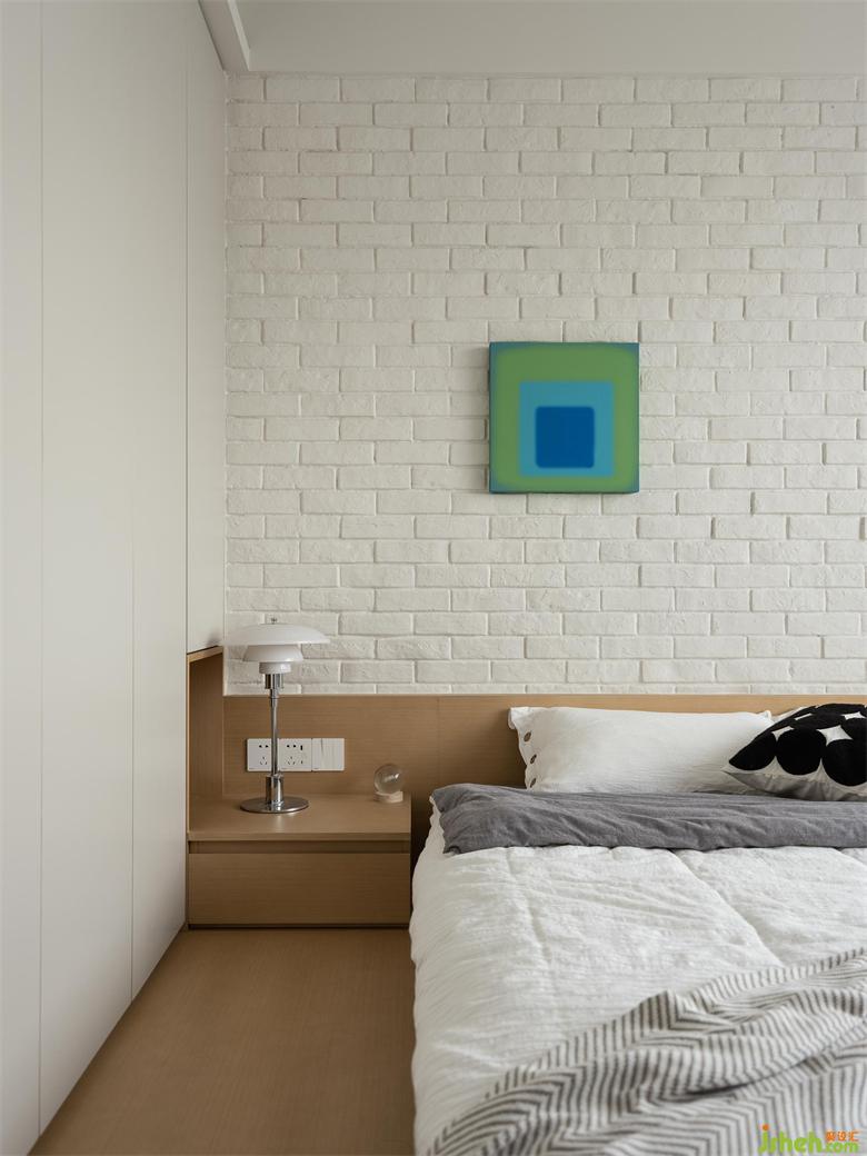 立體感墻皮鋪貼床頭背景墻,形成原始裸露的白墻效果,深圳南山東關樂尚林居家裝設計呼應全屋的北歐風格,讓臥室格調更加飽滿高級。