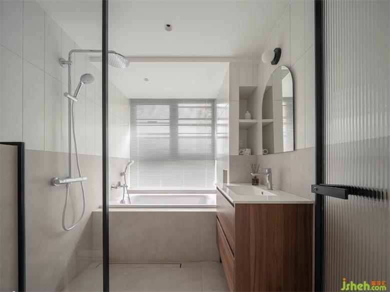 黑框長虹玻璃門作為主衛(wèi)入口,不影響臥室廊道采光效果,大白磚通鋪墻面地面,視覺清爽干凈,主衛(wèi)各項設施一應齊全,淋浴間以及浴缸帶來多選擇性沐浴體驗,提升生活質感。