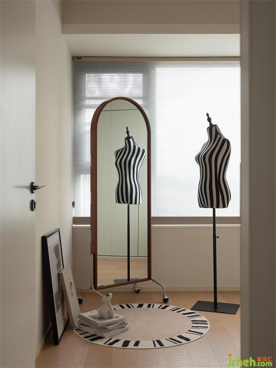 另一間次臥用來當做多功能衣帽間,也是女業(yè)主練習瑜伽的區(qū)域,翻板床+衣柜的結合創(chuàng)造復合式功能,為空間發(fā)揮更多可能性,兩墻衣柜滿足夫妻二人的所有衣物收納需求,深圳南山東關樂尚林居家裝設計配備可移動式穿衣鏡以及人形衣架,讓生活的每一面都精致無比。