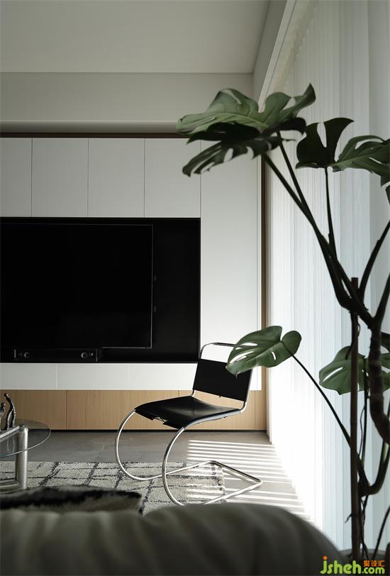 懸浮電視墻輕盈立體,柜體簡潔美觀,帶來豐富的儲物空間。深圳天健天驕裝修設(shè)計線條感單椅彰顯極簡美學(xué),展現(xiàn)空間氣質(zhì),夢幻簾分割光影,加上綠植的點綴,客廳空間清透會呼吸。