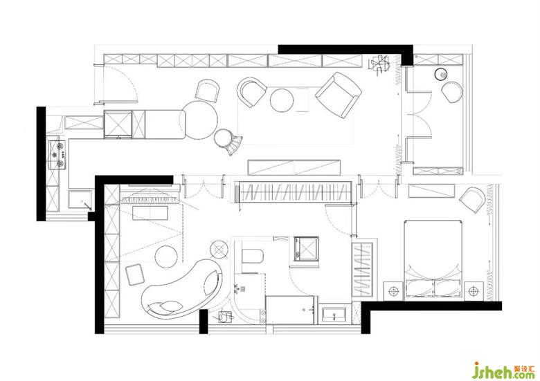 本案的布局也是一大亮點,一人獨居給了我們很大的操作空間,按照業(yè)主生活習慣,整合出獨具一格的居住環(huán)境: