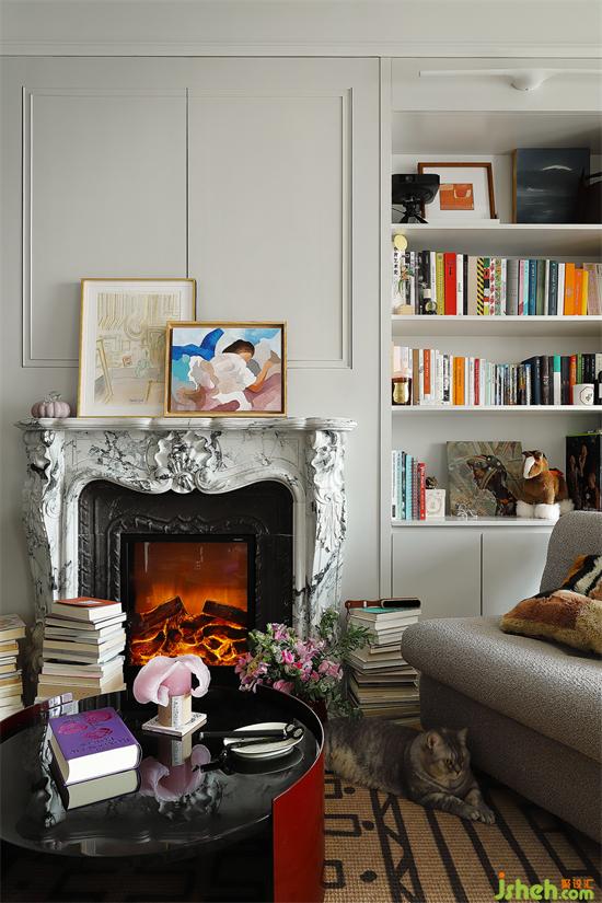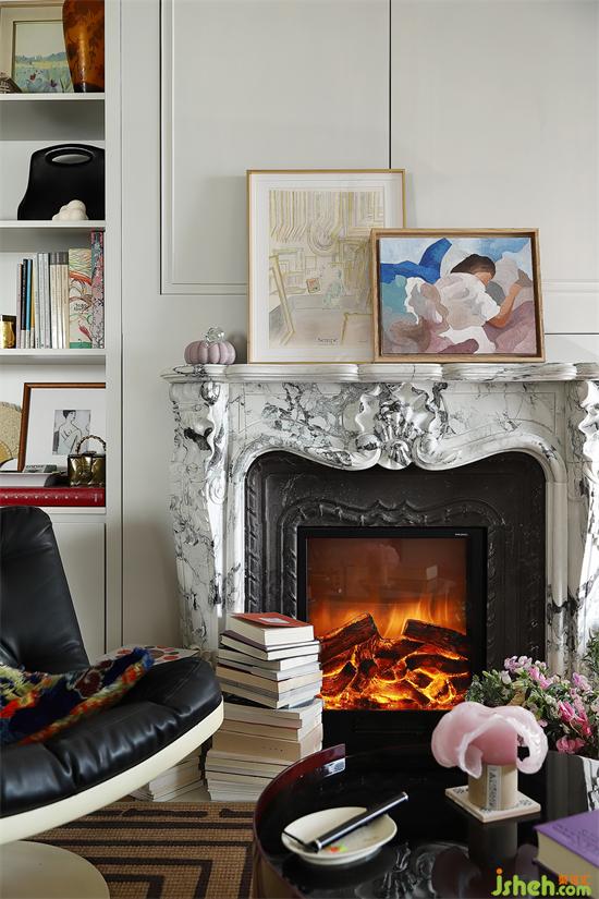 電子煙霧壁爐,采用純正的法式造型,奠定客廳格調,電子火光暖意洋洋,法式公寓風格堆砌的書籍營造慵懶的書香氛圍,法式公寓的情調躍然紙上,生活精致且優(yōu)雅。