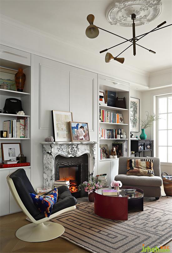 壁爐居中而置,兩側以收納柜對稱展開,除了做書架外,法式公寓風格還能展示各種擺件以及裝飾畫,豐富空間格調,單人沙發(fā)款式各異,空間靈動且趣味十足。
