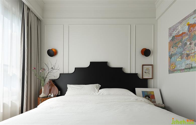 背景墻采用石膏線條簡(jiǎn)單裝飾,重點(diǎn)來突出床頭的造型感,定制床頭盡顯業(yè)主高品質(zhì)審美。兩側(cè)搭配小巧壁燈,呼應(yīng)床頭顏色,大氣高級(jí)的復(fù)古調(diào)充分迸發(fā),黑與白的碰撞多了一份時(shí)尚的優(yōu)雅感。