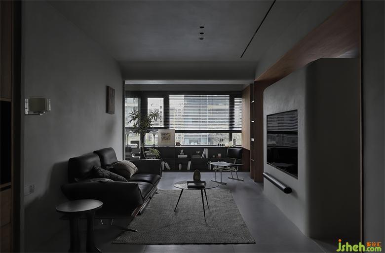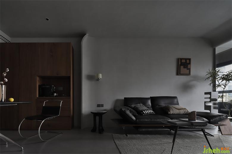 造型硬挺、座包寬大的黑色皮質(zhì)沙發(fā),給人深陷其中的云端舒適坐感,與淺灰麻色的地毯、圓幾,形成灰色調(diào)的層次漸變與疊加,看似簡(jiǎn)約的搭配,每一處視點(diǎn)卻細(xì)微知著。