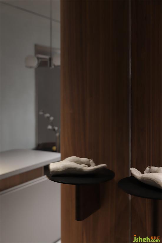 弧形線條柔緩隔出下沉式玄關(guān),水磨石地磚豐富空間質(zhì)感,穿衣鏡頂天立地,深圳首地容御豪宅設(shè)計(jì)保持墻面完整度,鏡面對(duì)稱關(guān)系從視覺(jué)上拉伸空間,減少入戶區(qū)的狹小逼仄感。