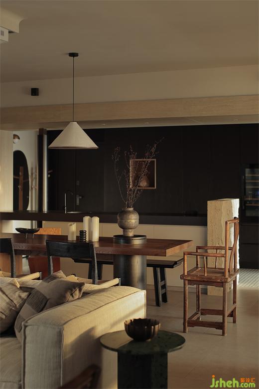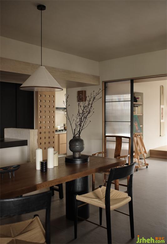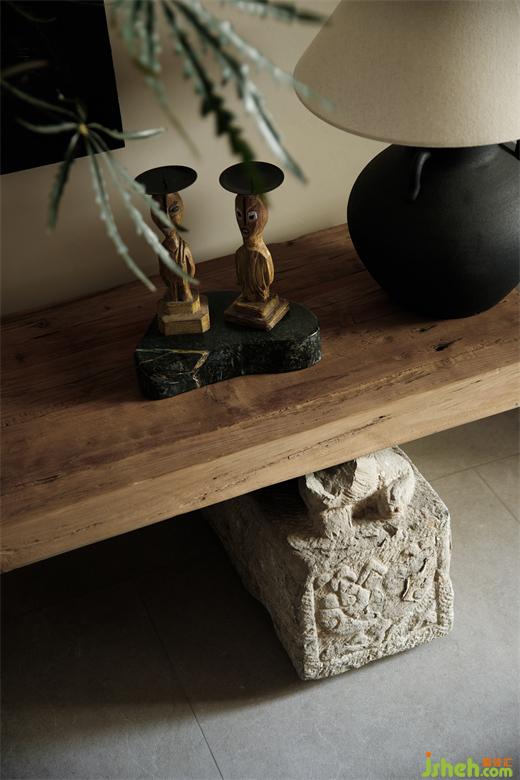 于細(xì)節(jié)上注重飾品的美學(xué)陳列,讓每處角落得以自成風(fēng)景;于是有了角落陳設(shè)的老房舊門的基石、轉(zhuǎn)角處禪意的石頭當(dāng)?shù)鬃?