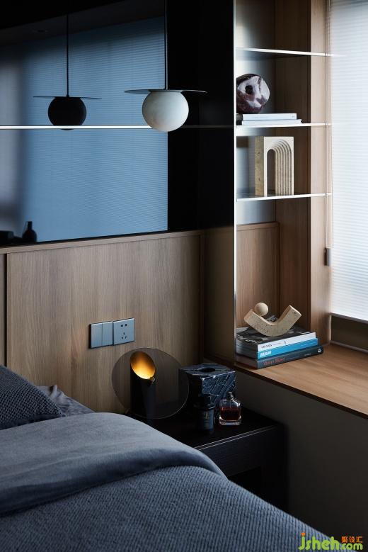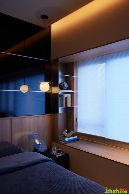 主臥睡眠區(qū)延續(xù)空間的主色調,床頭背景墻采用用黑玻+不銹鋼金屬條,天花內嵌燈帶,營造了一個高格調的睡眠環(huán)境同時增加了一份神秘感。