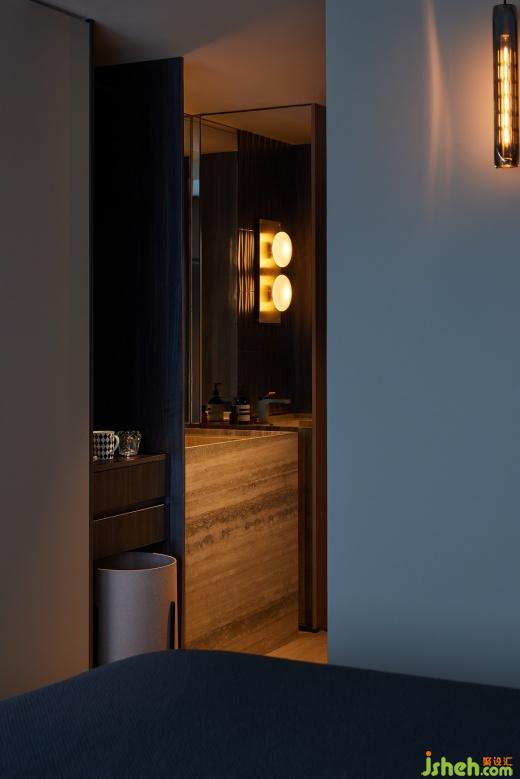 淺色的洗手臺外置,連卡佛洞石深沉而冷峻,仿佛承載著夜的寂靜,一側的柜體隱匿于黑暗之中,等待著被探索。