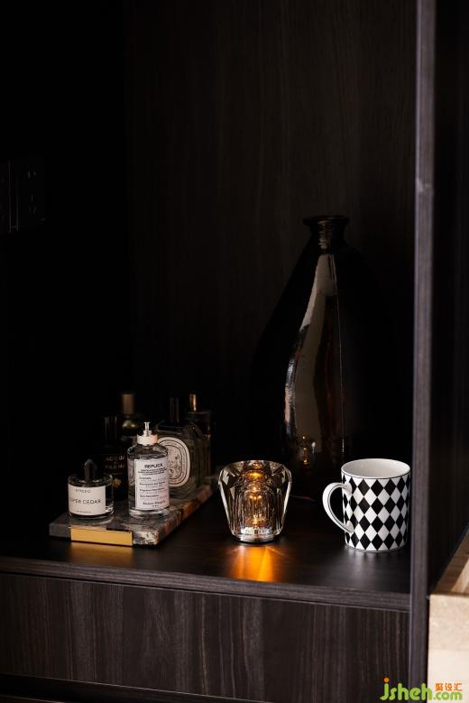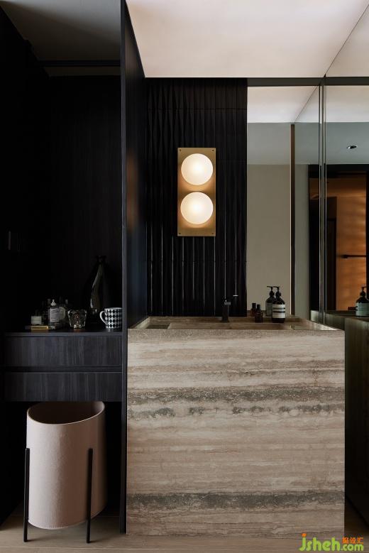 暗黑系的洗手臺外置設計,宛如夜之精靈的舞臺,而那溫暖的黃色燈光,則是這場舞臺的主角。