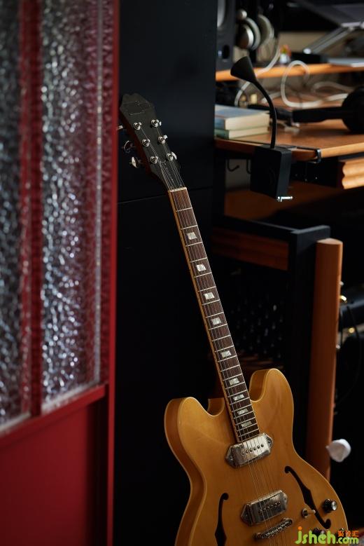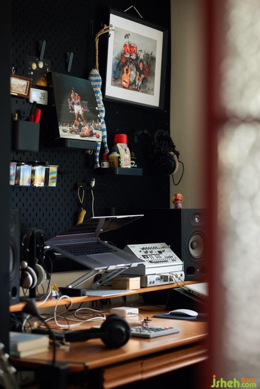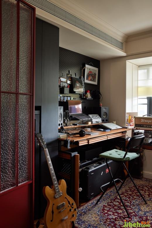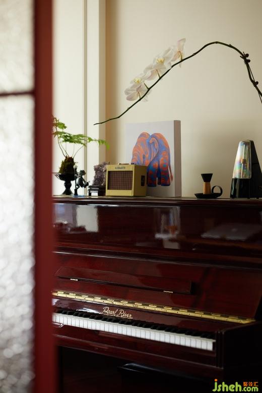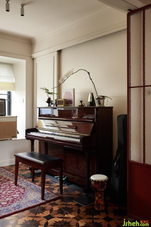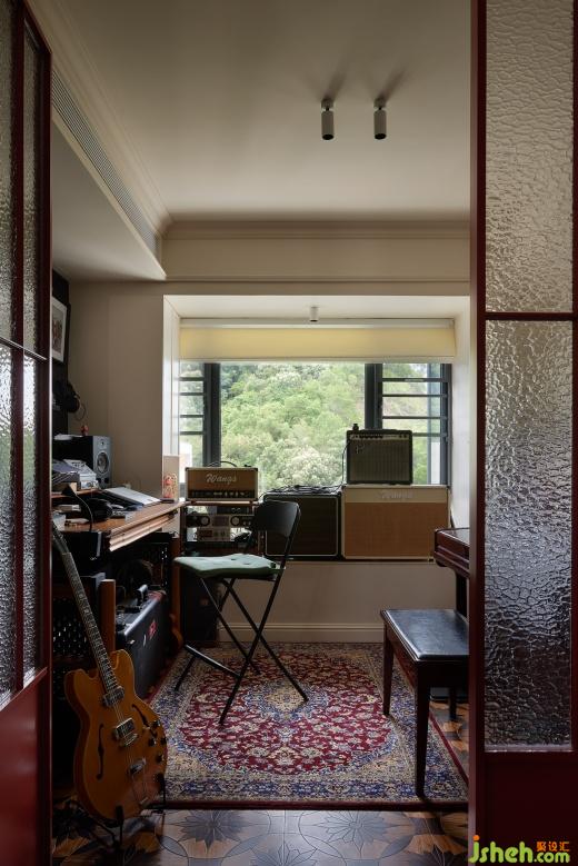 透過復(fù)古玻璃門,可以看到里面若隱若現(xiàn)的景色,仿佛這個音樂房是一個獨立的音樂世界,卻又與外界有著若有若無的聯(lián)系。