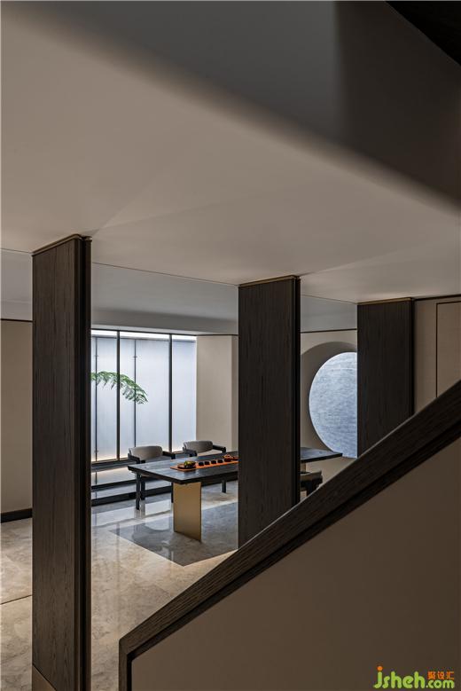 飲茶區(qū)采用建筑的開口設(shè)計,北京半山別墅設(shè)計讓方與圓相結(jié)合,呼應(yīng)東方文化中的天圓地方。天窗的設(shè)置,便于將陽光引入室內(nèi),而洞口金屬編織的屏風(fēng)則起到些許遮擋作用,隨著時間流逝,照射角度亦隨之變化,光影似乎成了大自然的調(diào)色板,描繪出一幅幅趣味、溫馨的畫卷。