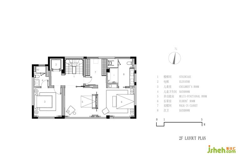 考慮到空間的多變性與時間延展性,于二層設(shè)置多功能房??缮惦[形床能實現(xiàn)不同需求下的功能轉(zhuǎn)換,白天變身兒童娛樂區(qū),夜晚則是保姆間,陪護(hù)幼兒起居。房間一側(cè)巧設(shè)兩扇門與老人房相連,互動性與私密性兼具。