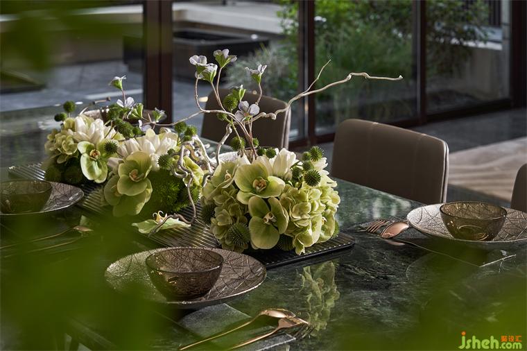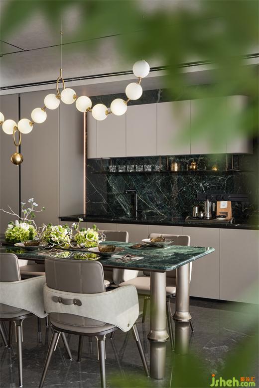 中西廚臺(tái)面及墻面以貓眼綠石材鋪就,讓生機(jī)盎然的“綠”蔓延至各處,也構(gòu)筑起居者自然、健康、開(kāi)闊的生活居所。