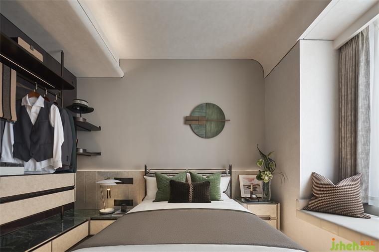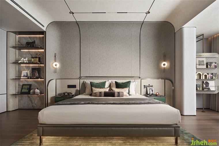 主臥置于二層,由始至終的儀式感貫穿其中,進(jìn)門(mén)展示層架與弧形手法呈現(xiàn)的床背,勾勒出豐潤(rùn)舒暢的狀態(tài),材質(zhì)紋理突出,在灰度適中的燈光渲染下,簡(jiǎn)約而不失格調(diào),樣板間設(shè)計(jì)以涓涓細(xì)流匯聚生活詩(shī)意。