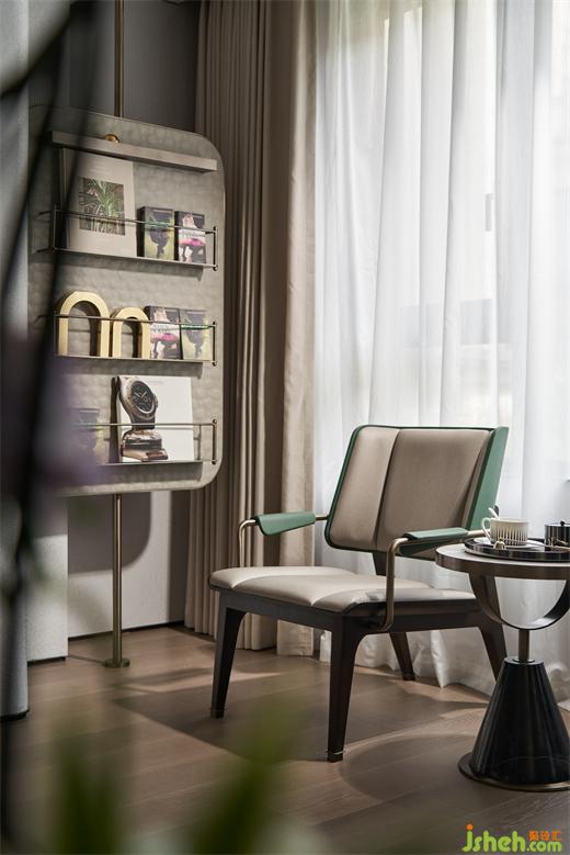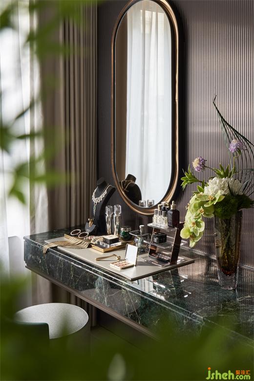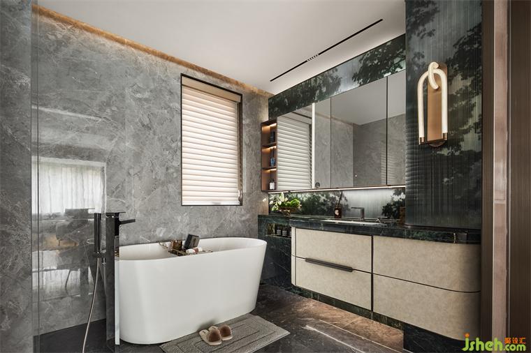 主衛(wèi)也依然不乏自然與生機(jī),貓眼石沿用于此,搭配綠色夾絲玻璃,樣板間設(shè)計(jì)將“綠”進(jìn)行到底,更添一絲靈動(dòng)愜意。