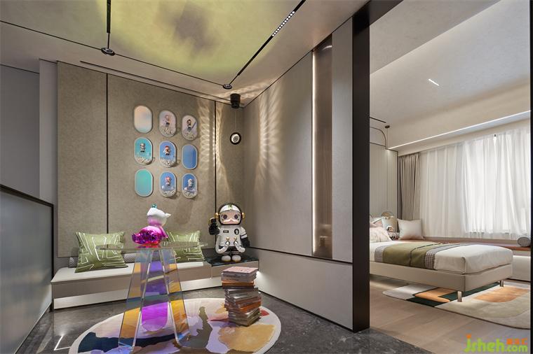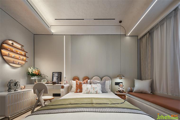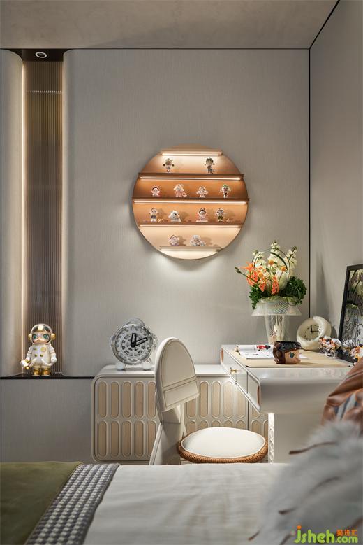 家具與裝飾邊角柔和,臥室氛圍明亮輕松,墻面圓形展示柜搭配優(yōu)雅的燈光,極具個(gè)性與趣味,為兒童構(gòu)筑茁壯成長(zhǎng)的快樂(lè)環(huán)境。