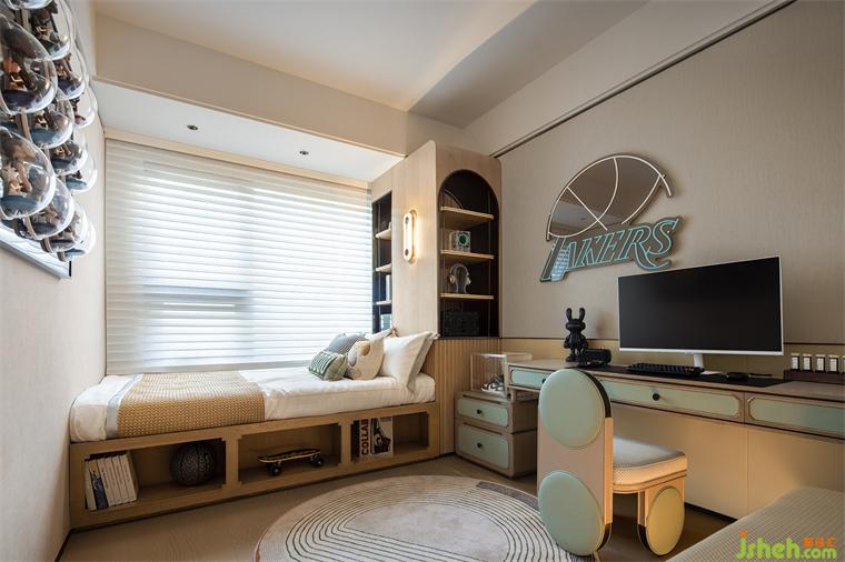 考慮到尺寸的最優(yōu)化利用,男孩房巧妙的將窗體與床箱結(jié)合,規(guī)劃出睡眠區(qū)、親子娛樂與學(xué)習(xí)區(qū),也勾勒出父母與孩子的美好時光。