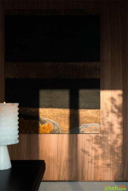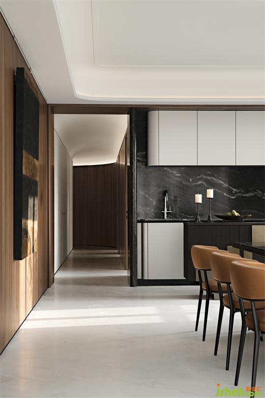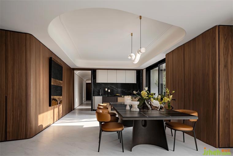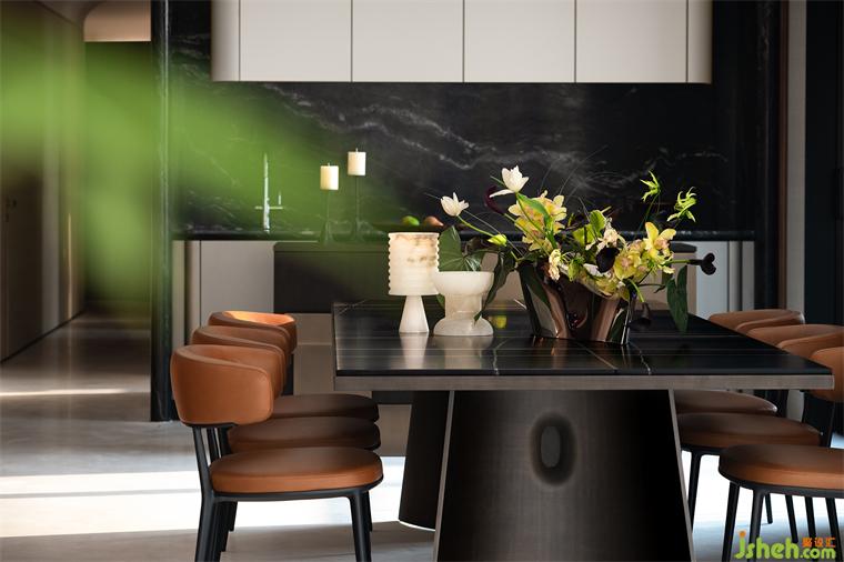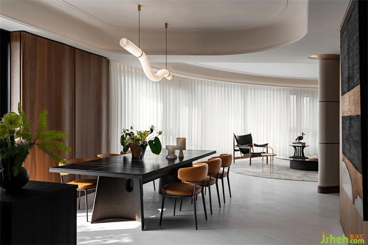 餐廳置有與翠湖入戶大堂同系列的云石吊燈,以一條流暢的曲線引導(dǎo)感知。在某種程度上,這既是從外部到歸家的過渡,又渲染著自由舒緩的狀態(tài)。這也是設(shè)計(jì)師世亮注重設(shè)計(jì)語匯的統(tǒng)一和延續(xù)的又一印證。