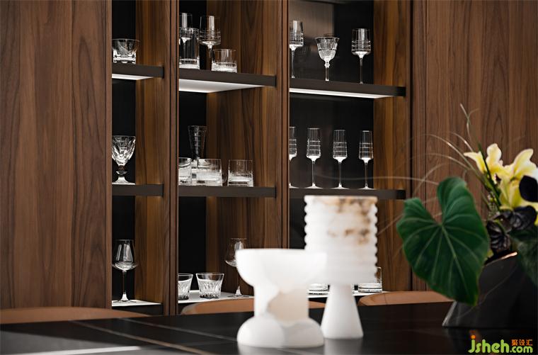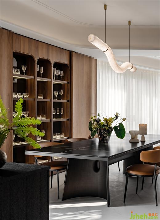 所謂“人養(yǎng)晶、晶養(yǎng)人”,業(yè)主對(duì)水晶有著天然的好感與偏愛,擁有數(shù)不清的巴卡拉。大平層設(shè)計(jì)餐廳的曲面墻因勢(shì)化身水晶的展示舞臺(tái),移門開合間,琳瑯滿目的水晶熠熠生輝,極具秩序美感。這些不僅是物質(zhì)性的外在流露,更是情感性的向內(nèi)延伸。