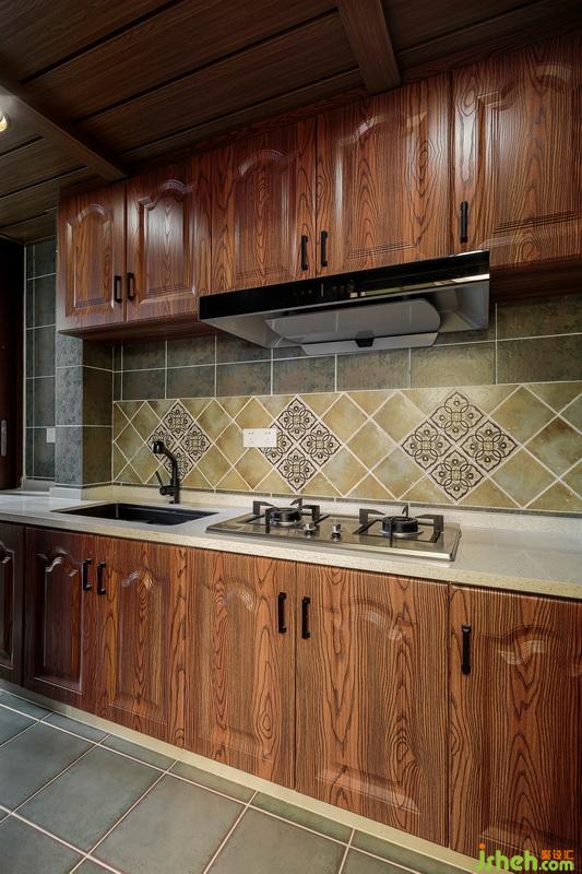 廚房復(fù)古磚配花磚點(diǎn)綴,配以木紋柜門(mén),頂面室內(nèi)設(shè)計(jì)師在設(shè)計(jì)采用木色拉槽處理