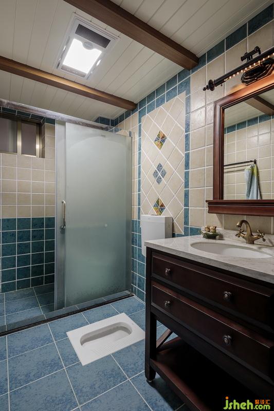 室內(nèi)設(shè)計(jì)師采用冷暖復(fù)古磚拼貼墻地面,頂面橫梁設(shè)計(jì)與整室風(fēng)格呼應(yīng)