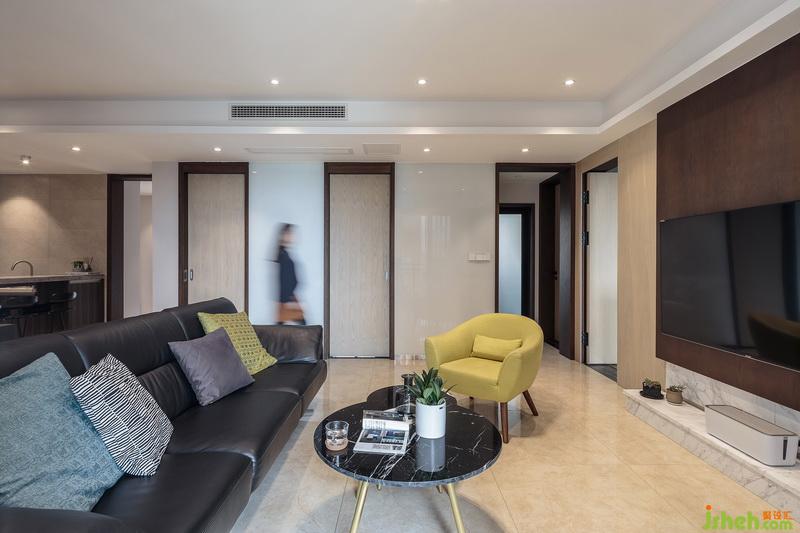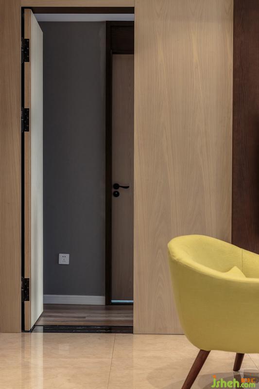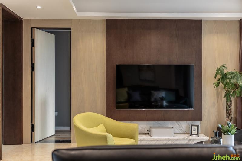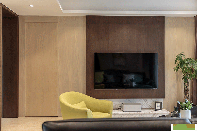 主臥的門在客廳電視墻位置,使原本就不大的電視墻更是分割得支零破碎,所以我們做了隱形門處理,讓客廳更顯得大氣。