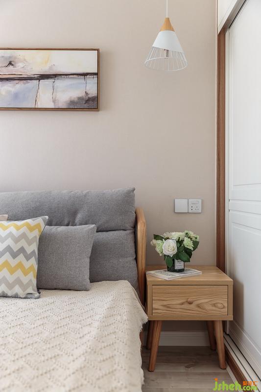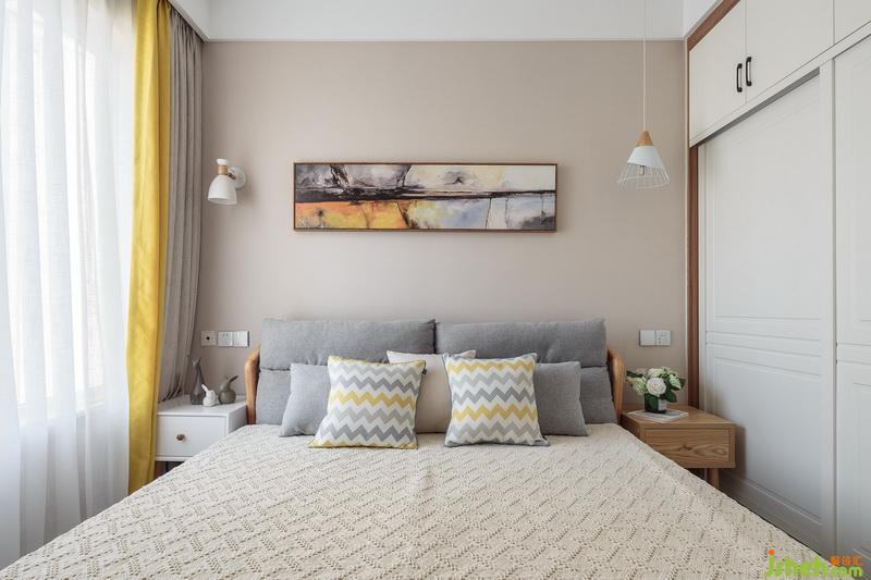 主臥延續(xù)淺咖色墻面,掛一幅抽象裝飾畫,輔以壁燈與懸掛式吊燈作臥室照明。