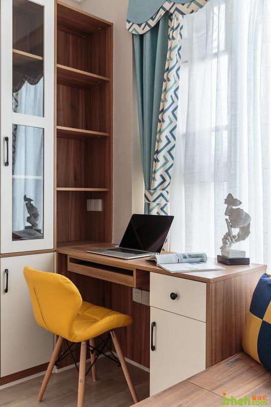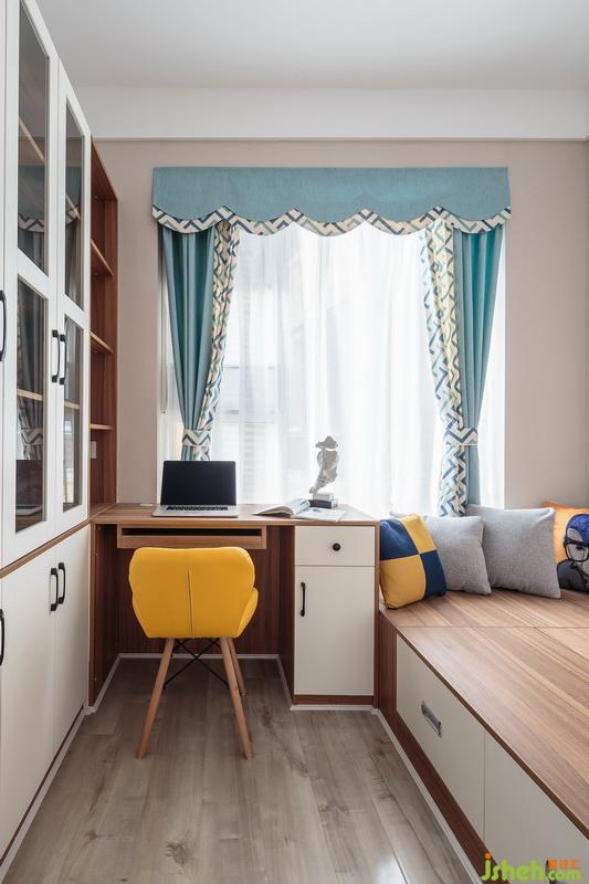 兒童房,設計榻榻米床鋪,寫字臺連接背景書架。