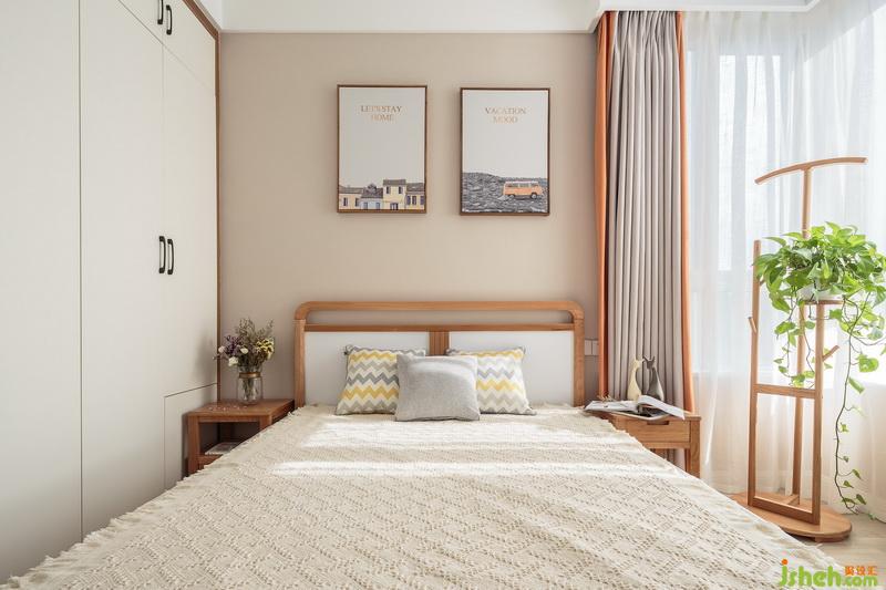 次臥,淺咖色搭配窗簾中的一抹橙色,配合大面積采光,讓臥室充滿暖意。