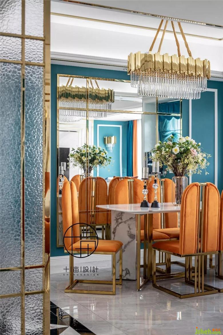 整體的元素定義在Art Deco(裝飾藝術(shù)),玄關(guān)地磚用了幾何的元素,餐廳鏡子是茶色一是和金屬色統(tǒng)一,二是餐廳空間并不大從視覺上讓空間更開闊,磨砂玻璃也是和金屬相嵌,呼之欲出的浪漫奢華氣息。