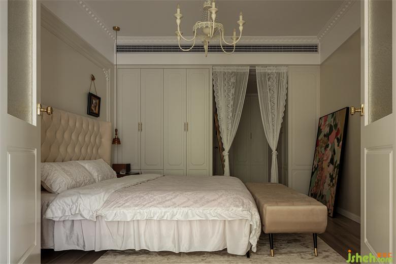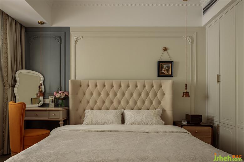 相比客廳與餐廳的“繁”,臥室設計還原本質,以“簡”為主。十畝家裝設計簡單的二分色劃分區(qū)域,讓睡眠與妝容空間秩序井然。