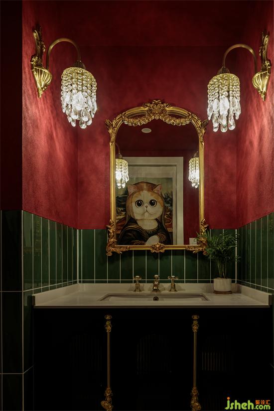 紅藍黑與客廳色彩相呼應,亮點是鏡面與掛畫巧妙地形成了“畫中畫”效果,十畝家裝設計對稱的吊燈和蒙娜麗莎貓咪掛畫是西式審美的詮釋。