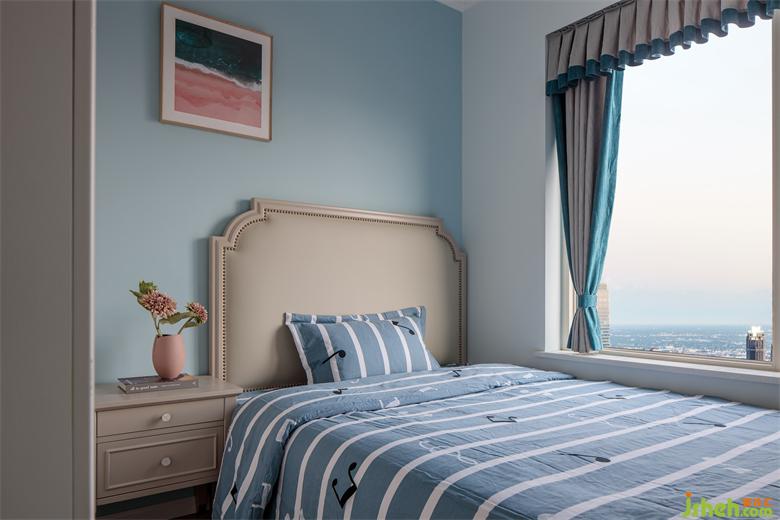 兒童房墻面使用淡藍色,家裝設(shè)計增添了清新爽適之感,緩解了空間的審美疲勞。