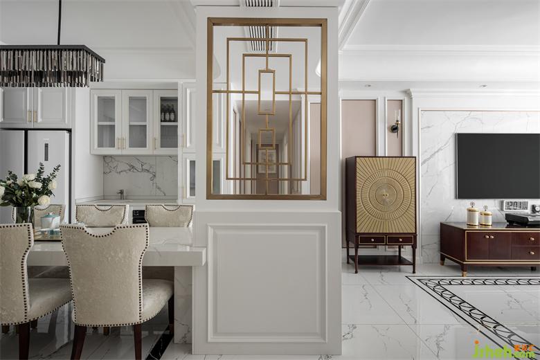 The white design makes the dining room more clean and bright. The highlight lies in the partition between the dining room and the living room. The golden frame improves the brightness of the space, enriches the color atmosphere, and makes the overall effect more natural and harmonious.