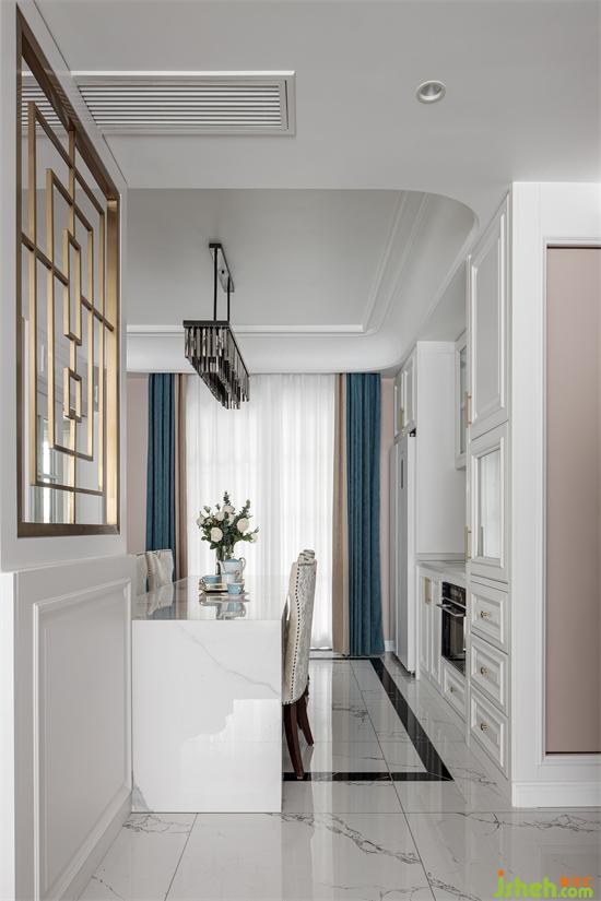 白色系的設(shè)計(jì)讓餐廳更加潔凈、明朗,亮點(diǎn)在于餐廳與客廳間的隔斷,金色邊框提升了空間亮度,家裝設(shè)計(jì)豐富了色彩氛圍,整體效果更加自然和諧。