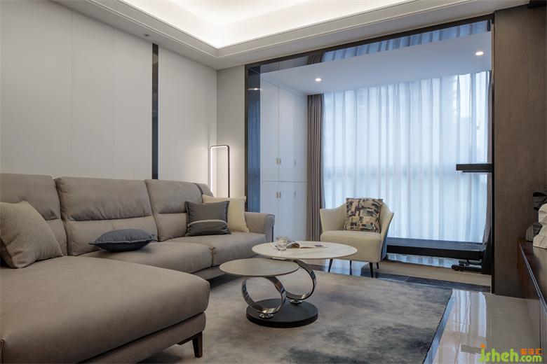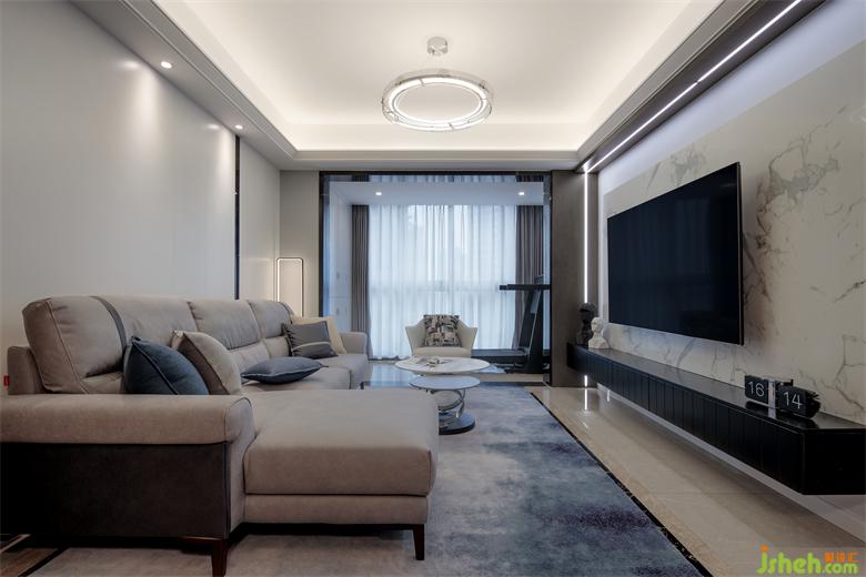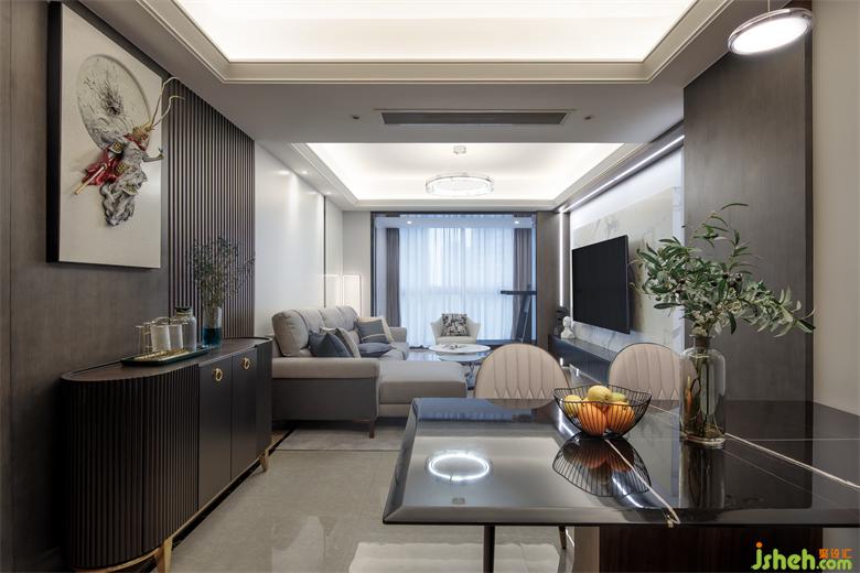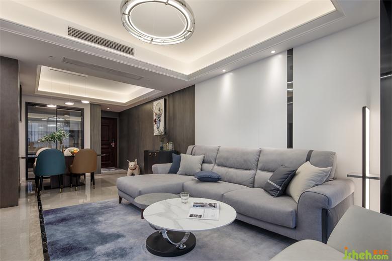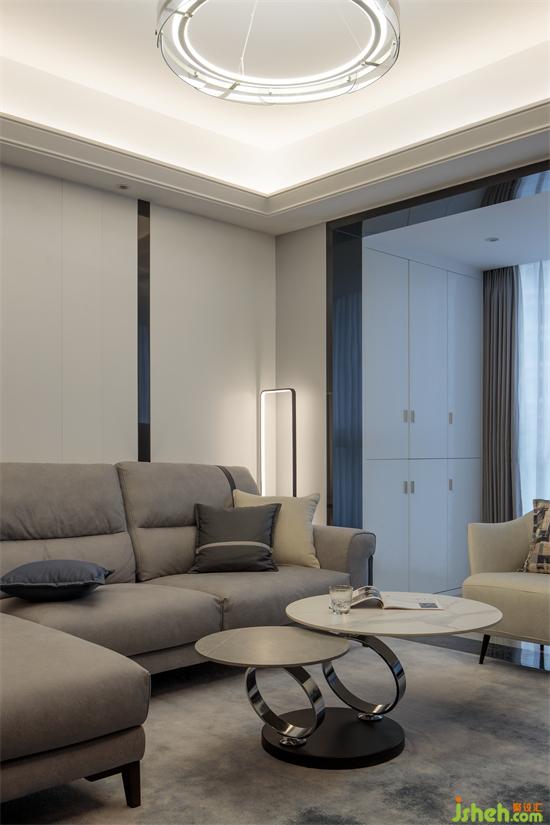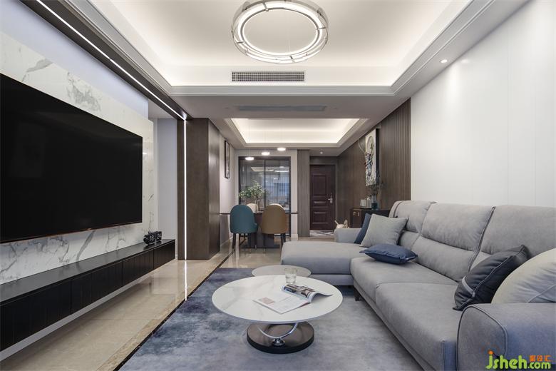 客廳主燈簡潔明了,家裝設(shè)計柔光燈帶設(shè)計增加了空間的溫馨感。