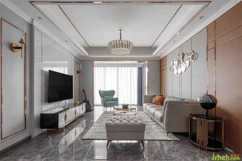 The house is square and broad. The ground and TV wall are made of bright ceramic tiles. Black and white color highlights the strong contrast between light and shade. Classic and noble coexist. The mirror is inlaid in it. It is as clear as water. The light and shadow effect is excellent, greatly improving the sense of spatial level.